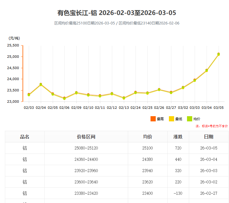 進(jìn)入2026年3月,國內(nèi)鋁錠價格迎來新一輪強(qiáng)勢上漲。根據(jù)長江有色網(wǎng)最新數(shù)據(jù),3月5日鋁錠均價已飆升至25100元/噸,單日漲幅高達(dá)720元,創(chuàng)下近階段新高。這一劇烈波動不僅牽動著上游電解鋁企業(yè)的神經(jīng),更對下游工業(yè)鋁型材 加工行業(yè)帶來了嚴(yán)峻的成本考驗。